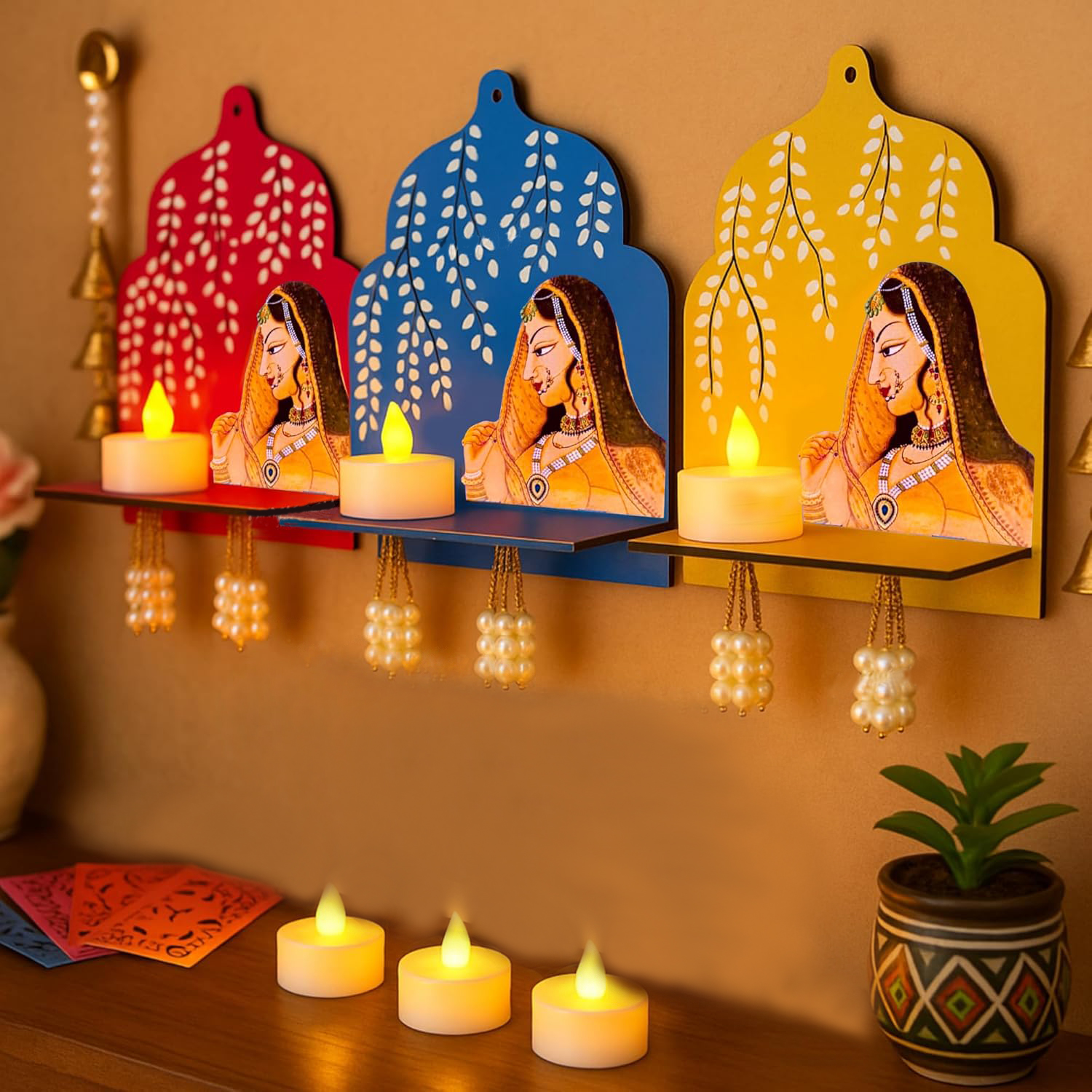 Designed to hold tealights or diyas, this wall hanging creates a soft, glowing ambience—perfect for Diwali décor, pooja rooms, living rooms, corridors, and festive corners. The handcrafted detailing and traditional motifs make it a stunning statement piece for ethnic home décor lovers.